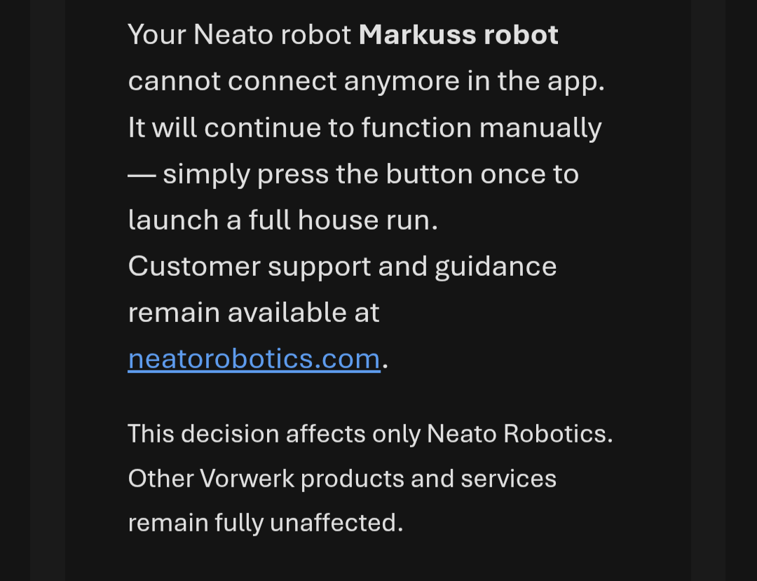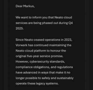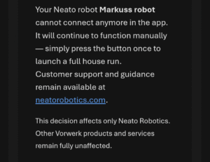 Företaget som köpte upp Neato redan 2023 annonserat att dom kommer släcka möjligheten till deras app för robotdammsugaren. Därigenom neka mig möjligheten till all smart styrning och nyttjandet av Lidar och kartor i dammsugaren. Här har jag skrivit en del om hur jag använde den innan